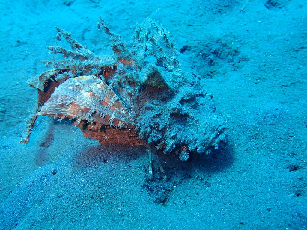 Seraya Secrets is dived for its macro potential. The gently sloping terrain allows divers to explore methodically, scanning the sand and rubble for well-camouflaged species.