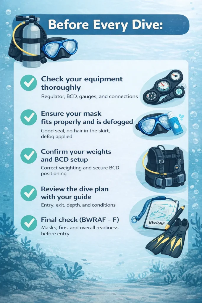Once your gear is assembled, a final buddy check helps catch anything that may have been missed. The BWRAF check is a simple and widely used system to make sure both divers are ready before entering the water.