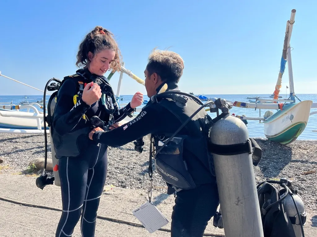 Many sites in areas such as Amed and Tulamben are shore dives, which means your entry and exit play a bigger role than in boat diving locations. Walking in with full gear over rocks or uneven ground, combined with small waves or surge, can make it easy to feel unsettled before the dive has even begun.